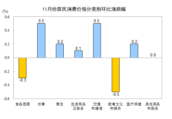 11月份,全國居民消費價格環比持平。其中,城市和農村均持平;食品價格下降0.5%,非食品價格上漲0.1%;消費品價格上漲0.1%,服務價格下降0.1%。