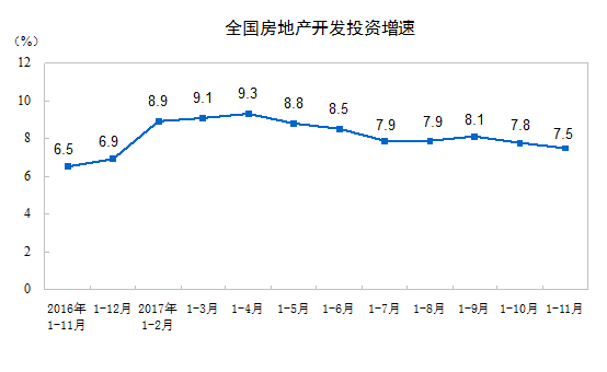 2017年1-11月份,全國(guó)房地產(chǎn)開(kāi)發(fā)投資100387億元,同比名義增長(zhǎng)7.5%,增速比1-10月份回落0.3個(gè)百分點(diǎn)。其中,住宅投資68670億元,增長(zhǎng)9.7%,增速回落0.2個(gè)百分點(diǎn)。住宅投資占房地產(chǎn)開(kāi)發(fā)投資的比重為68.4%。