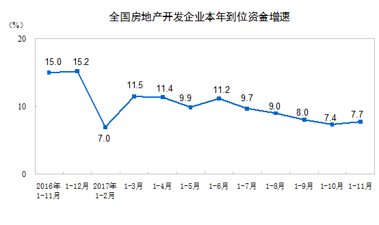 1-11月份,房地產(chǎn)開(kāi)發(fā)企業(yè)到位資金139489億元,同比增長(zhǎng)7.7%,增速比1-10月份提高0.3個(gè)百分點(diǎn)。其中,國(guó)內(nèi)貸款22649億元,增長(zhǎng)18.0%;利用外資147億元,增長(zhǎng)11.7%;自籌資金45997億元,增長(zhǎng)2.7%;其他資金70696億元,增長(zhǎng)8.1%。在其他資金中,定金及預(yù)收款42817億元,增長(zhǎng)15.0%;個(gè)人按揭貸款21612億元,下降1.6%。