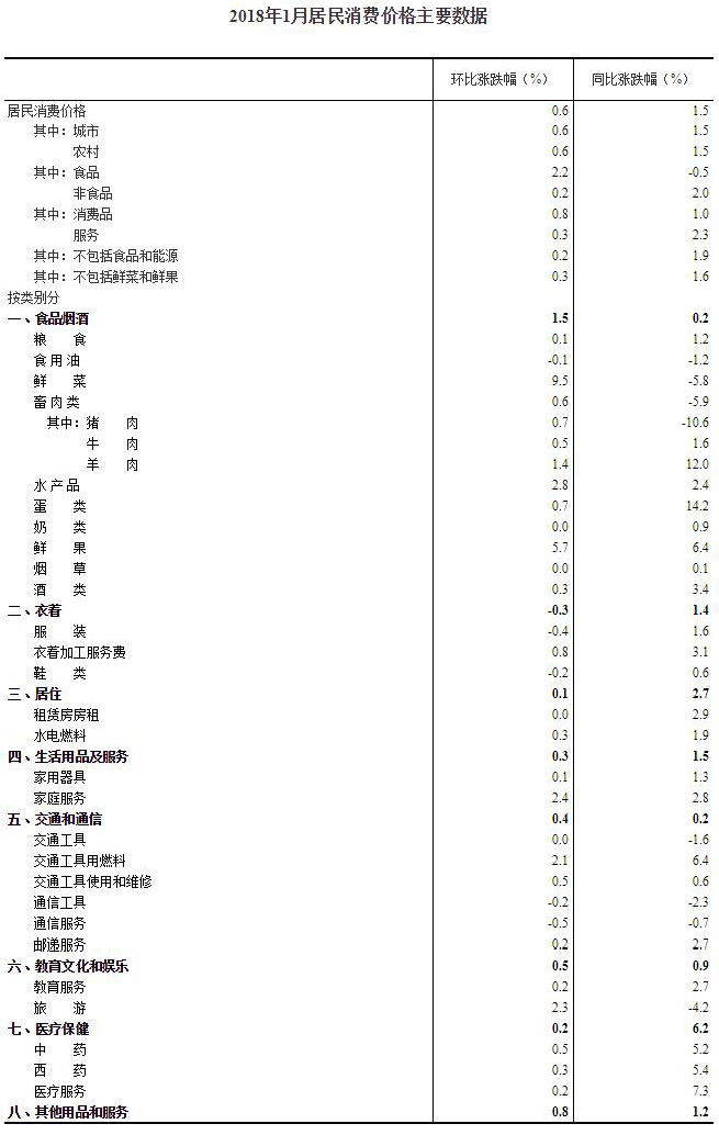 2018年1月份,全國居民消費價格同比上漲1.5%。其中,城市上漲1.5%,農(nóng)村上漲1.5%;食品價格下降0.5%,非食品價格上漲2.0%;消費品價格上漲1.0%,服務價格上漲2.3%。