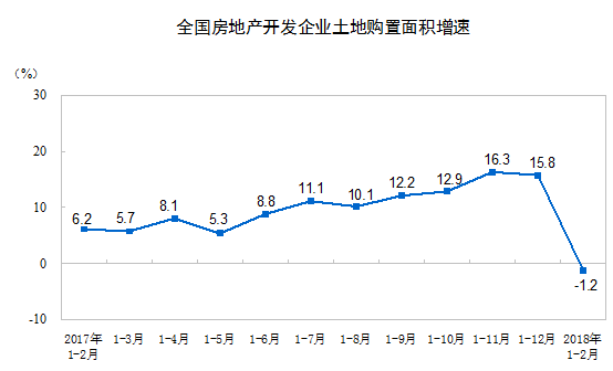 1-2月份,房地產開發企業土地購置面積2345萬平方米,同比下降1.2%,去年全年為增長15.8%;土地成交價款794億元,同比持平,去年全年為增長49.4%。