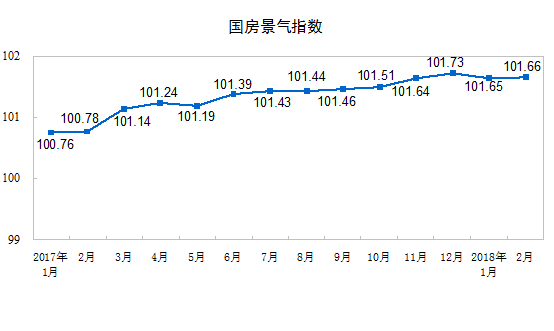2月份,房地產開發景氣指數(簡稱“國房景氣指數”)為101.66,比去年12月份回落0.07點。