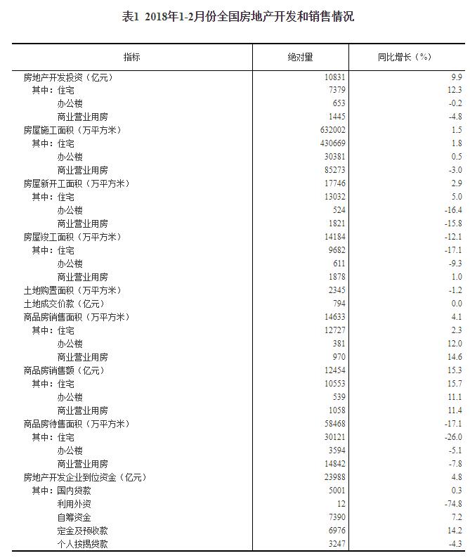 2018年1-2月份全國房地產開發投資和銷售情況