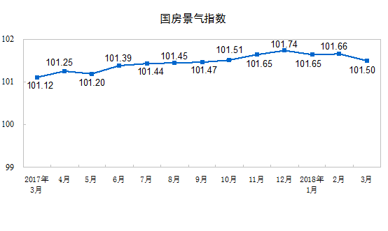 3月份,房地產開發景氣指數(簡稱“國房景氣指數”)為101.50,比2月份回落0.16點。