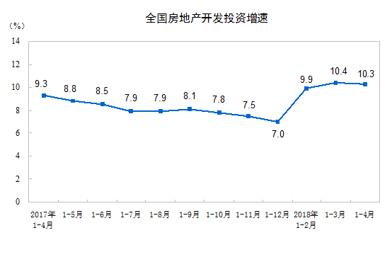 2018年1-4月份,全國(guó)房地產(chǎn)開發(fā)投資30592億元,同比名義增長(zhǎng)10.3%,增速比1-3月份回落0.1個(gè)百分點(diǎn)。其中,住宅投資21331億元,增長(zhǎng)14.2%,增速提高0.9個(gè)百分點(diǎn)。住宅投資占房地產(chǎn)開發(fā)投資的比重為69.7%。