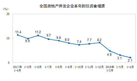1-4月份,房地產(chǎn)開發(fā)企業(yè)到位資金48192億元,同比增長(zhǎng)2.1%,增速比1-3月份回落1個(gè)百分點(diǎn)。其中,國(guó)內(nèi)貸款8637億元,下降1.6%;利用外資17億元,下降77.6%;自籌資金14894億元,增長(zhǎng)4.8%;定金及預(yù)收款14987億元,增長(zhǎng)8.3%;個(gè)人按揭貸款7148億元,下降6.7%。