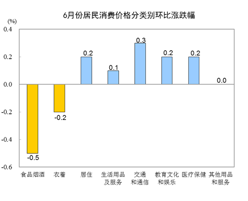 6月份,全國居民消費價格環比下降0.1%。其中,城市持平,農村下降0.1%;食品價格下降0.8%,非食品價格上漲0.1%;消費品價格下降0.2%,服務價格上漲0.2%。