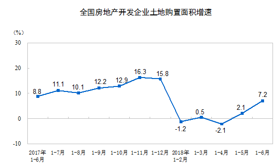 1-6月份,房地產(chǎn)開發(fā)企業(yè)土地購置面積11085萬平方米,同比增長7.2%,增速比1-5月份提高5.1個百分點;土地成交價款5265億元,增長20.3%,增速提高4.3個百分點。