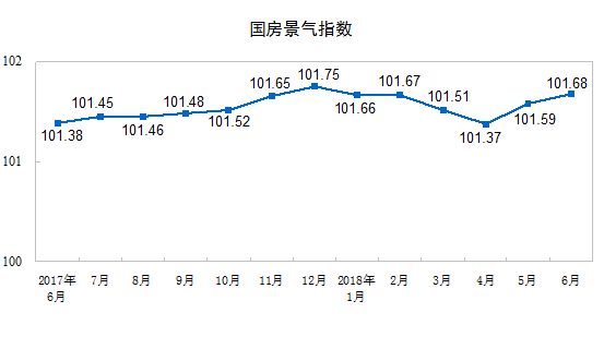 6月份,房地產(chǎn)開發(fā)景氣指數(shù)(簡稱“國房景氣指數(shù)”)為101.68,比5月份提高0.09點。