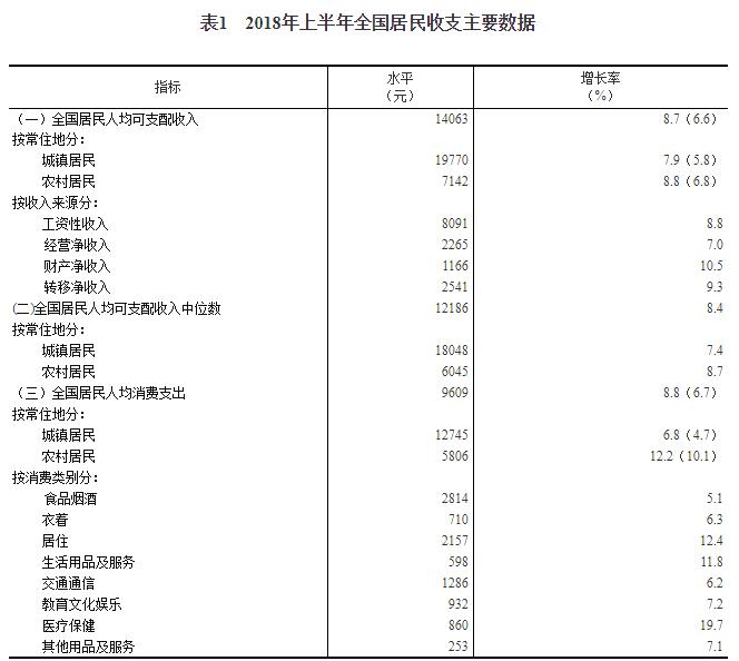 2018年上半年,全國居民人均可支配收入14063元,比上年同期名義增長8.7%,扣除價格因素,實際增長6.6%。其中,城鎮居民人均可支配收入19770元,增長(以下如無特別說明,均為同比名義增長) 7.9%,扣除價格因素,實際增長5.8%;農村居民人均可支配收入7142元,增長8.8%,扣除價格因素,實際增長6.8%。