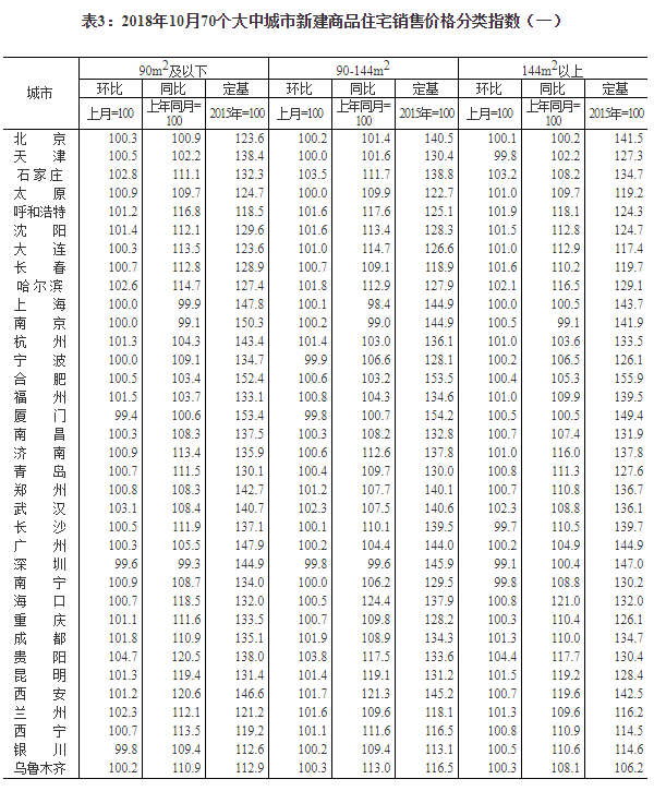 2018年10月份70個大中城市商品住宅銷售價格變動情況