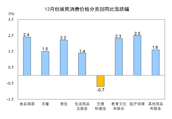 12月份,食品煙酒價格同比上漲2.4%,影響居民消費價格指數(CPI)上漲約0.72個百分點。其中,鮮果價格上漲9.4%,影響CPI上漲約0.16個百分點;禽肉類價格上漲5.4%,影響CPI上漲約0.06個百分點;鮮菜價格上漲4.2%,影響CPI上漲約0.10個百分點;水產品價格上漲2.0%,影響CPI上漲約0.04個百分點;畜肉類價格上漲0.8%,影響CPI上漲約0.04個百分點(豬肉價格下降1.5%,影響CPI下降約0.04個百分點);糧食價格上漲0.5%,影響CPI上漲約0.01個百分點;雞蛋價格下降1.4%,影響CPI下降約0.01個百分點。