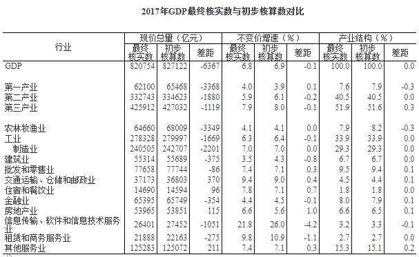 經最終核實,2017年,GDP現價總量為820754億元,比初步核算數減少了6367億元;按不變價格計算,比上年增長6.8%,比初步核算數下降0.1個百分點。三次產業和各行業數據見附表。