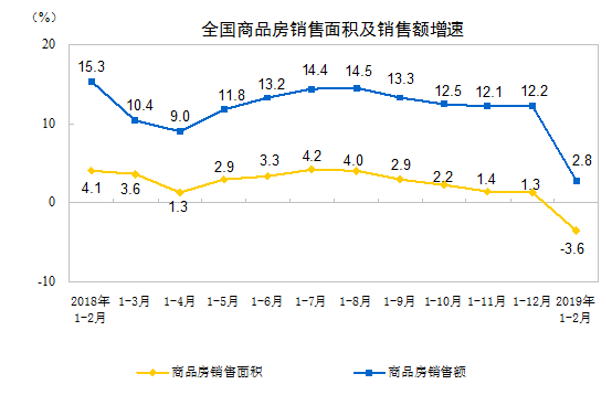 2月末,商品房待售面積52251萬平方米,比2018年末減少162萬平方米。其中,住宅待售面積增加117萬平方米,辦公樓待售面積增加49萬平方米,商業(yè)營業(yè)用房待售面積減少393萬平方米。
