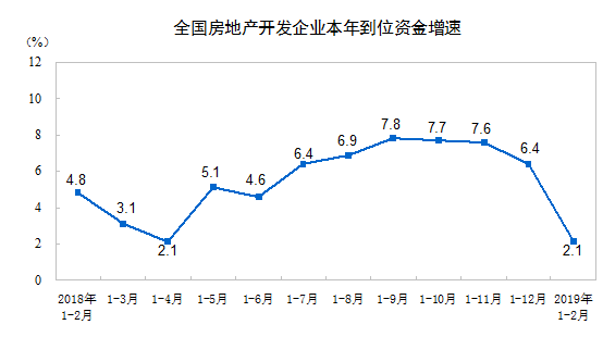 1-2月份,房地產(chǎn)開發(fā)企業(yè)到位資金24497億元,同比增長2.1%,增速比2018年全年回落4.3個(gè)百分點(diǎn)。其中,國內(nèi)貸款4976億元,下降0.5%;利用外資52億元,增長3.3倍;自籌資金7279億元,下降1.5%;定金及預(yù)收款7366億元,增長5.6%;個(gè)人按揭貸款3458億元,增長6.5%。