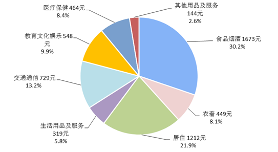 一季度,全國居民人均食品煙酒消費支出1673元,增長3.6%,占人均消費支出的比重為30.2%;人均衣著消費支出449元,增長1.7%,占人均消費支出的比重為8.1%;人均居住消費支出1212元,增長9.5%,占人均消費支出的比重為21.9%;人均生活用品及服務消費支出319元,增長3.1%,占人均消費支出的比重為5.8%;人均交通通信消費支出729元,增長7.8%,占人均消費支出的比重為13.2%;人均教育文化娛樂消費支出548元,增長20.6%,占人均消費支出的比重為9.9%;人均醫療保健消費支出464元,增長9.3%,占人均消費支出的比重為8.4%;人均其他用品及服務消費支出144元,增長7.1%,占人均消費支出的比重為2.6%。