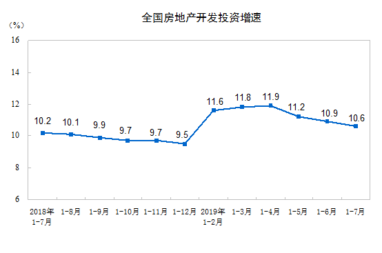 2019年1—7月份,全國房地產開發投資72843億元,同比增長10.6%,增速比1—6月份回落0.3個百分點。其中,住宅投資53466億元,增長15.1%,增速回落0.7個百分點。住宅投資占房地產開發投資的比重為73.4%。