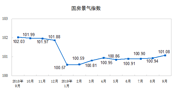 9月份,房地產(chǎn)開發(fā)景氣指數(shù)(簡稱“國房景氣指數(shù)”)為101.08,比8月份提高0.14點(diǎn)。