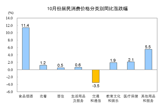 10月份,食品煙酒類價(jià)格同比上漲11.4%,影響CPI(居民消費(fèi)價(jià)格指數(shù))上漲約3.37個(gè)百分點(diǎn)。食品中,畜肉類價(jià)格上漲66.8%,影響CPI上漲約2.92個(gè)百分點(diǎn),其中豬肉價(jià)格上漲101.3%,影響CPI上漲約2.43個(gè)百分點(diǎn);禽肉類價(jià)格上漲17.3%,影響CPI上漲約0.21個(gè)百分點(diǎn);雞蛋價(jià)格上漲12.3%,影響CPI上漲約0.07個(gè)百分點(diǎn);水產(chǎn)品價(jià)格上漲2.7%,影響CPI上漲約0.05個(gè)百分點(diǎn);糧食價(jià)格上漲0.5%,影響CPI上漲約0.01個(gè)百分點(diǎn);鮮菜價(jià)格下降10.2%,影響CPI下降約0.27個(gè)百分點(diǎn);鮮果價(jià)格下降0.3%,影響CPI下降約0.01個(gè)百分點(diǎn)。