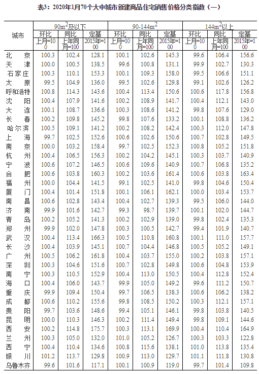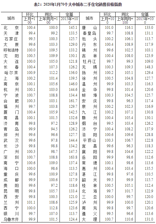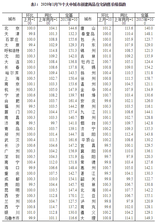 2020年1月份70個(gè)大中城市商品住宅銷售價(jià)格變動(dòng)情況