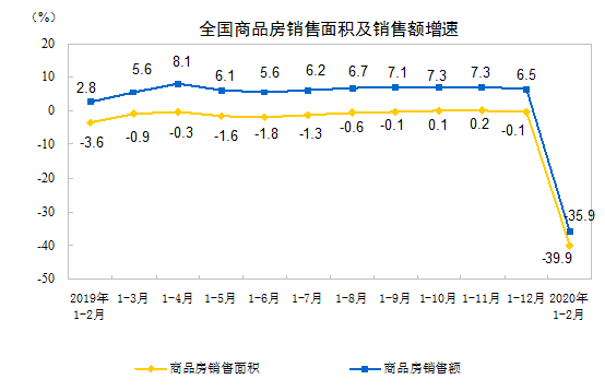 1—2月份,商品房銷售面積8475萬平方米,同比下降39.9%。其中,住宅銷售面積下降39.2%,辦公樓銷售面積下降48.4%,商業營業用房銷售面積下降46.0%。商品房銷售額8203億元,下降35.9%。其中,住宅銷售額下降34.7%,辦公樓銷售額下降40.6%,商業營業用房銷售額下降46.0%。