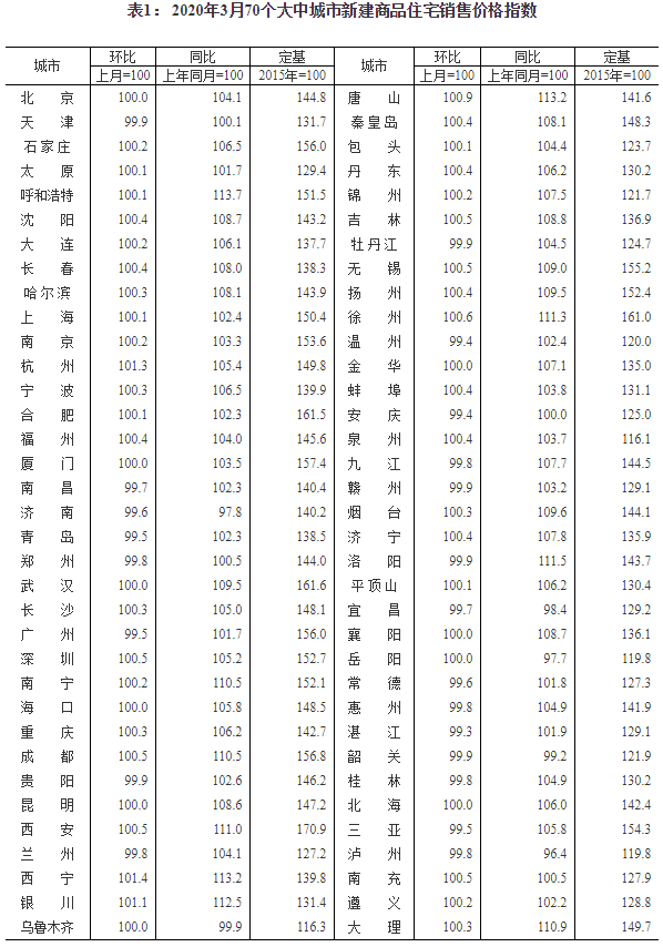 2020年3月份70個大中城市商品住宅銷售價格變動情況