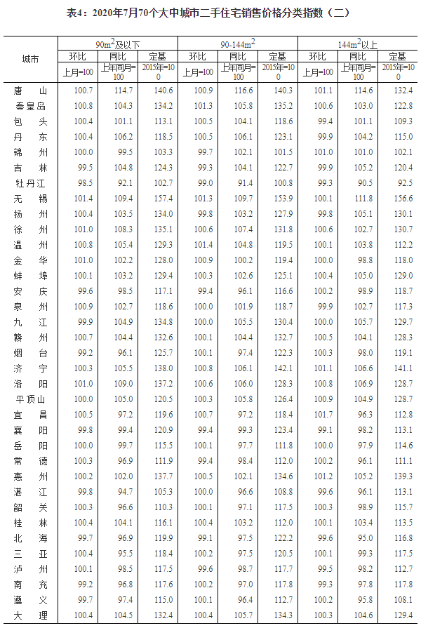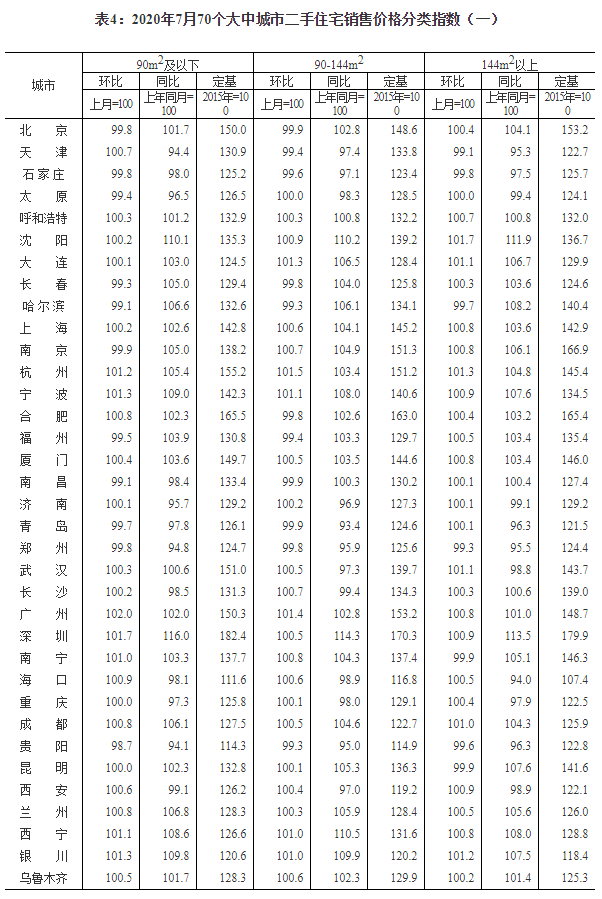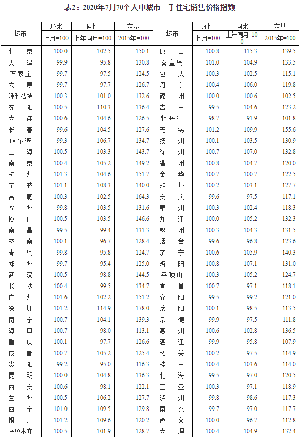 2020年7月份70個大中城市商品住宅銷售價格變動情況