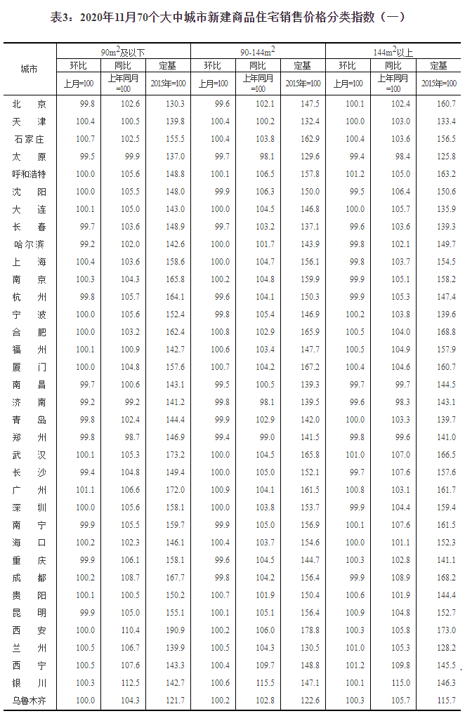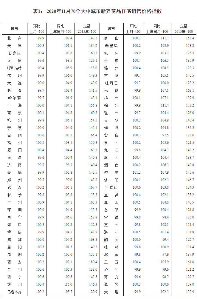 2020年11月份70個大中城市商品住宅銷售價格變動情況