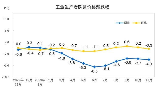 2023年11月份,全國工業(yè)生產(chǎn)者出廠價(jià)格同比下降3.0%,環(huán)比下降0.3%;工業(yè)生產(chǎn)者購進(jìn)價(jià)格同比下降4.0%,環(huán)比下降0.3%。1—11月平均,工業(yè)生產(chǎn)者出廠價(jià)格比上年同期下降3.1%,工業(yè)生產(chǎn)者購進(jìn)價(jià)格下降3.6%。